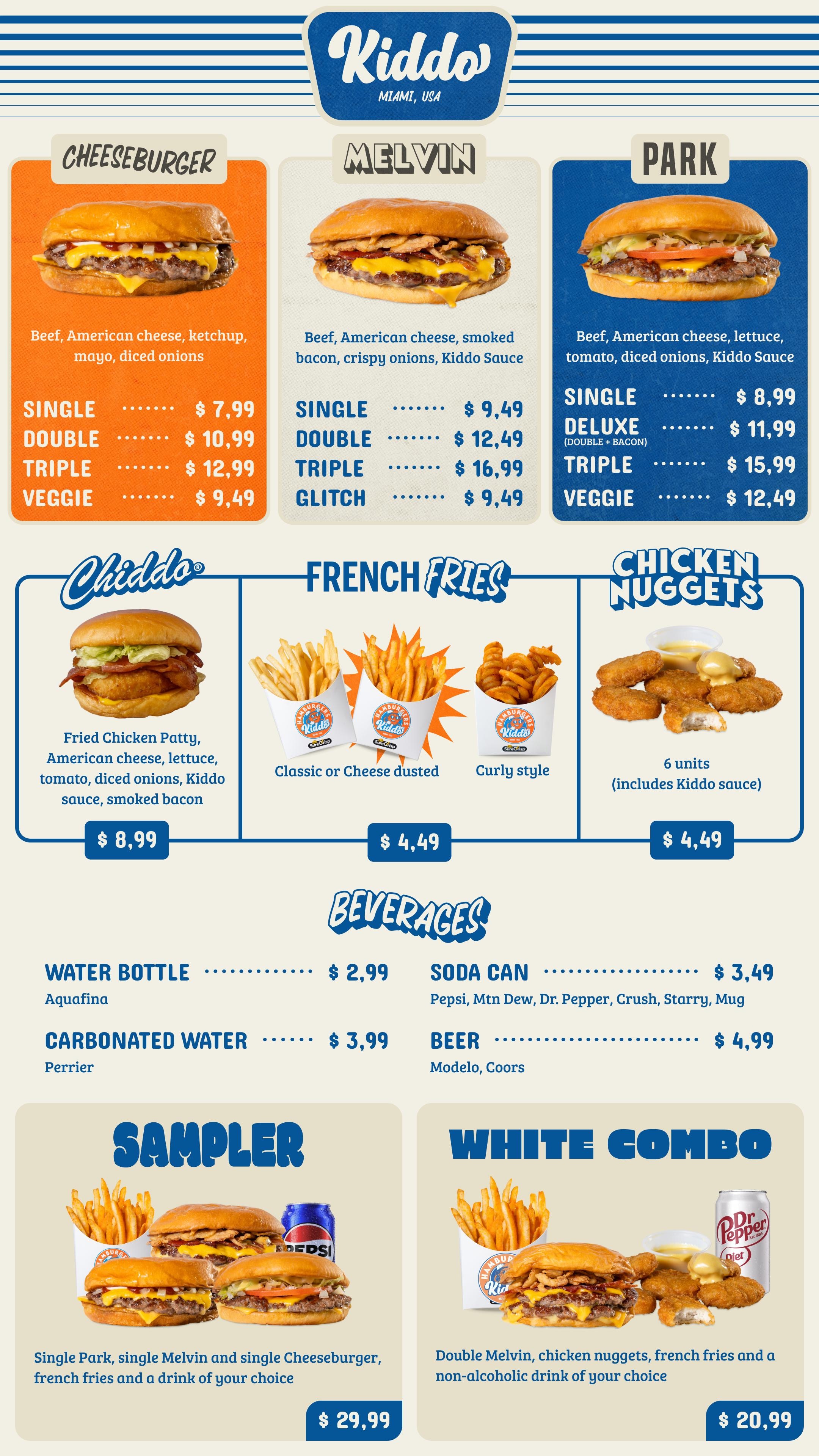 Kiddo Burgers is open 7 days a week for lunch, dinner, and late-night eats.