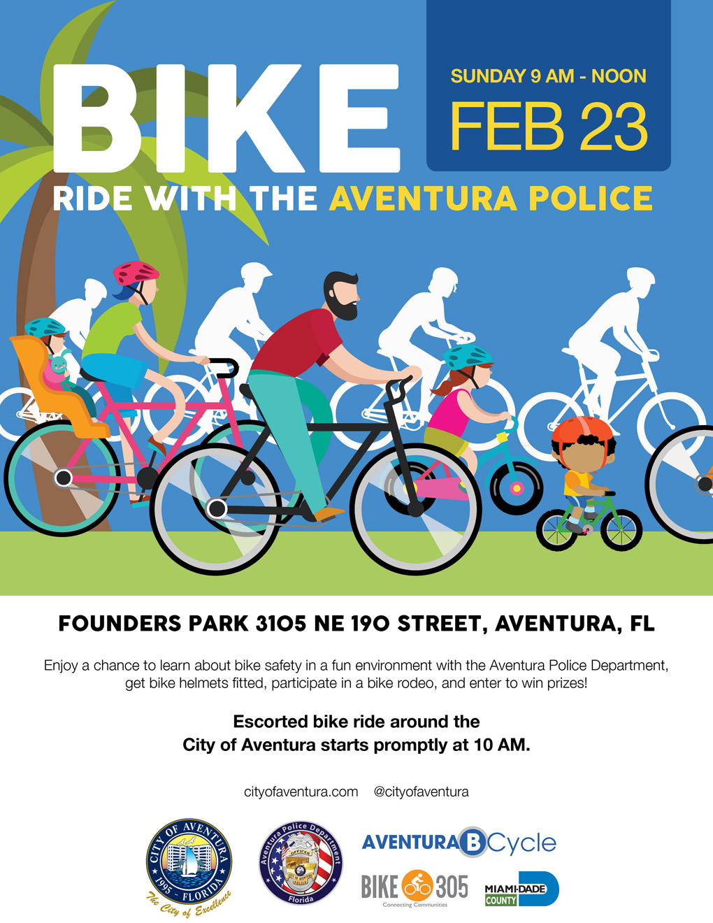 The City of Aventura and the Aventura Police Department will host Ride with the Aventura Police, a bike safety and ride event to promote safe cycling practices on Sunday, February 23, 2019. Come ride with us!