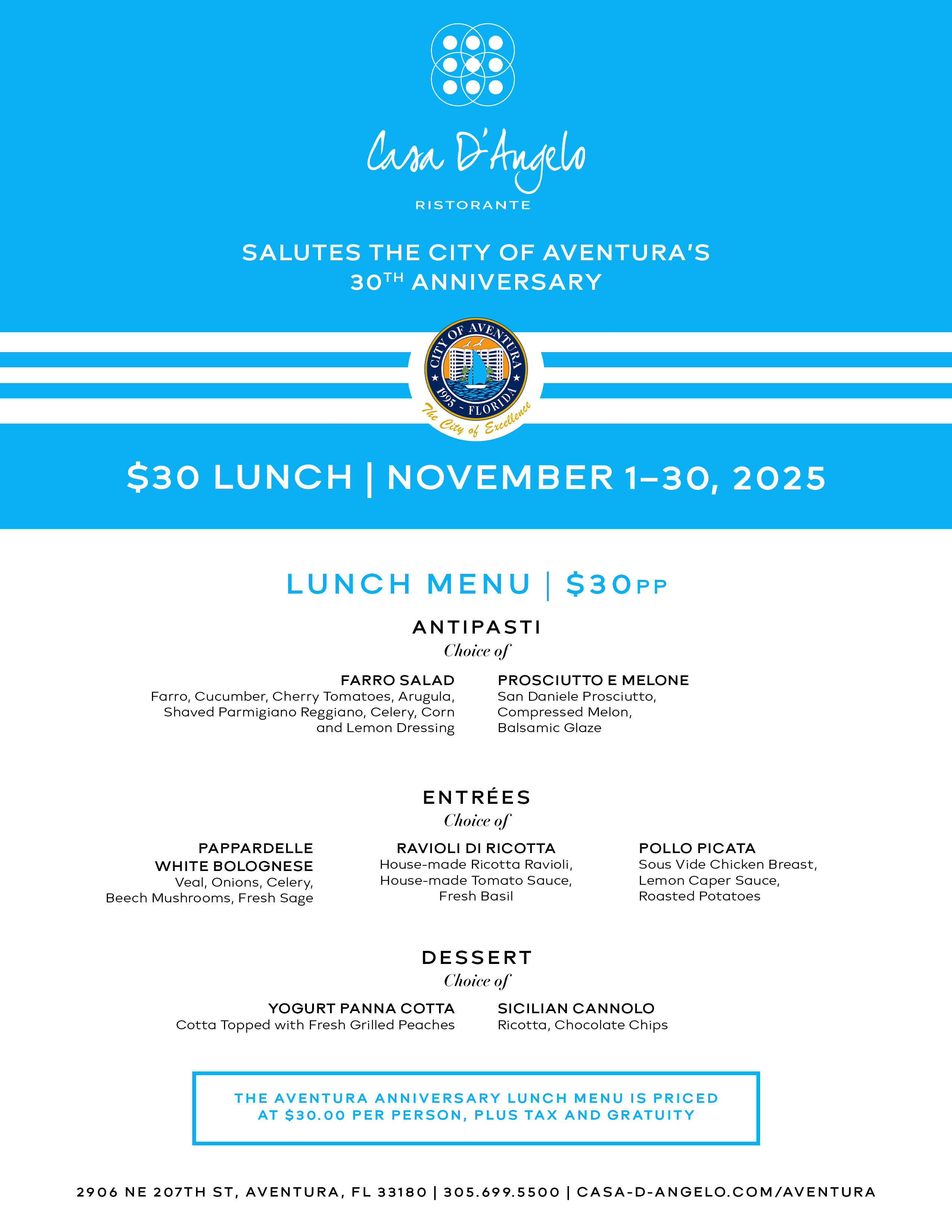 Casa D’Angelo invites you to savor the flavors of Italy with a specially crafted lunch menu for Aventura’s $30 Flavor Fest. Begin with light antipasti that set the tone for an elegant meal, followed by handmade pastas and classic Italian entrées that highlight the richness of traditional recipes. End on a sweet note with a timeless dessert, prepared with the same care and authenticity that defines every dish.